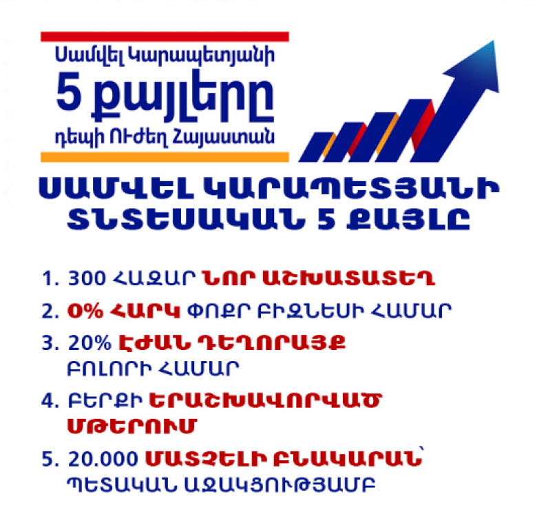 «Ուժեղ Հայաստան» կուսակցությունը հայտարարում է, որ իր տնտեսական հինգ քայլերը մի ամբողջական ծրագիր են, որը նպատակ ունի դուրս բերել երկիրը տնտեսական դժվարություններից և առաջարկել զարգացման նոր ուղի։ Կուսակցության ներկայացուցիչների խոսքով՝ իրենց ներկայացրած մոտեցումները նպատակ ունեն ձևավորել քաղաքական նոր որակ, որը կտարբերվի ինչպես նախկին, այնպես էլ ներկայիս քաղաքական փորձից՝ կենտրոնանալով իրական տնտեսական արդյունքների վրա։