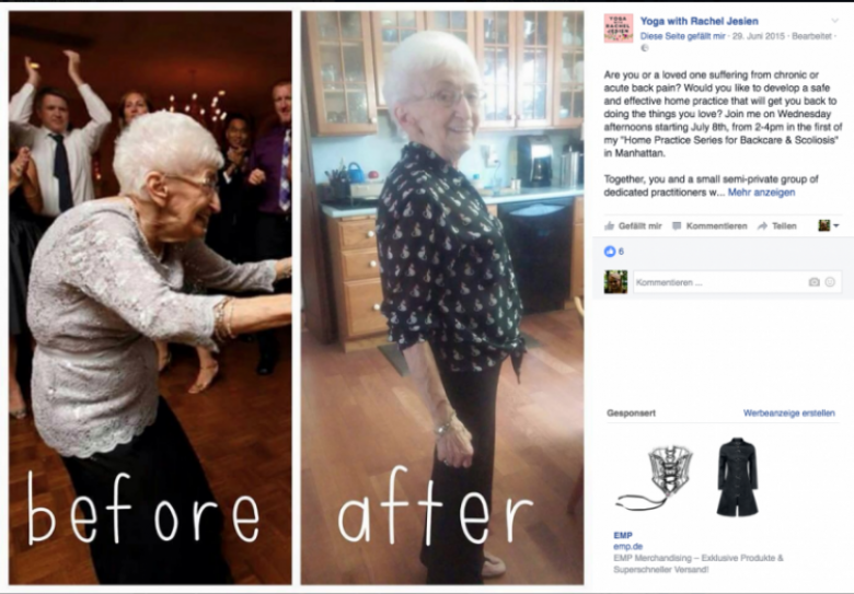 Մի անգամ էլ տարեց կինը որոշեց հյուր գնալ աղջկան: Երեք ամիս անց նա այնտեղ ծանոթացավ 28-ամյա Ռեյչել Ջեսենի հետ, ով ժամանակին ևս տառապել էր մեջքի ցավից, իսկ այժմ զբաղվում է յոգայով: