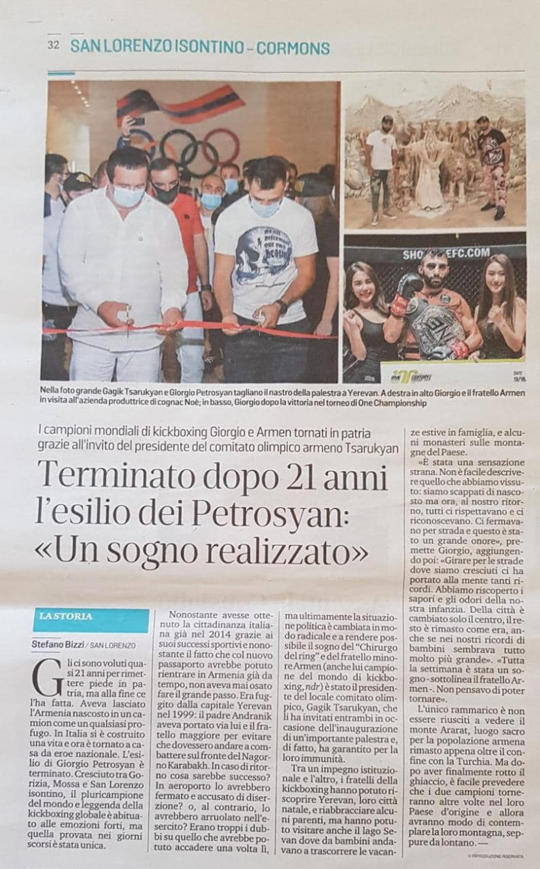 Իտալական հեղինակավոր «Իլ Պիկոլո» շաբաթաթերթը անդրադարձել է K1-ի ռինգերում տարբեր վարկածներով աշխարհի քառակի չեմպիոն Ջորջիո Պետրոսյանի Հայաստան կատարած այցին: Իտալական շաբաթաթերթը գրել է, որ աշխարհահռչակ հայ մարզիկը ավելի քան 21 տարի երազել է հայրենիք այցելելու մասին, բայց ինչ-ինչ պատճառներով չէր ստացվում և ահա Հայաստանի ազգային օլիմպիական կոմիտեի նախագահ Գագիկ Ծառուկյանի կողմից պաշտոնական հրավեր ստանալուց հետո նա վերջապես այցելել է իր պատմական հայրենիք: Թերթը գրել է, որ Ջորջիոն Հայաստանում որպես պատվավոր հյուր մասնակցել է «Մուլտի Ֆայթ» ակումբի նոր մարզադահլիճի բացման արարողությանը և ՀԱՕԿ նախագահ Գագիկ Ծառուկյանի հետ կտրել է կարմիր ժապավենը: Թերթում հրապարակված է նաև Ջորջիո Պետրոսյանի «Նոյ» կոնյակի-գինու գործարանում արված լուսանկարը: «Իլ Պիկոլո» շաբաթաթրթում նաև գրված է, որ Ջորջիո Պետրոսյանն ու «Մուլտի Ֆայթ» ակումբը քննարկում են հետագայում համագործակցելու տարբերակները:
