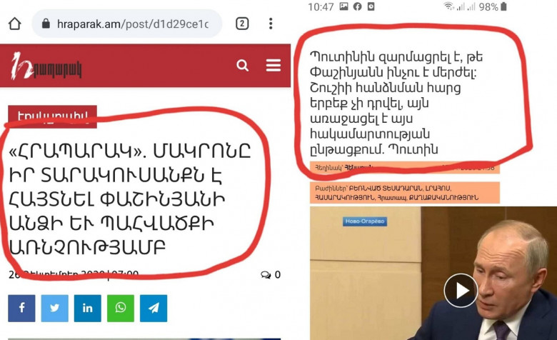 Հիշեցնեմ, որ Նիկոլի վերաբերյալ գրեթե "նույնաբովանդակ" մեկնաբանություն է արել նաև ՌԴ նախագահ Վլադիմիր Պուտինը, ով նոյեմբերի 17-ին Ռոսիա 24 հեռուսաալիքին տված հարցազրույցի ժամանակ մեկնաբանելով վերջին արցախյան պատերազմի ժամանակ իր քայլերը հայտարարել է."Դեռևս մեկ ամիս առաջ համոզել էի Իլհամ Ալիևին դադարեցնել պատերազմը Հայաստանի համար աննշան տարածքային կորուստով, սակայն Նիկոլ Փաշինյանը չի համաձայնել...Ինձ համար անսպասելի ձևովով Նիկոլ Փաշինյանն ասաց,որ դա իր համար անընդունելի է"...