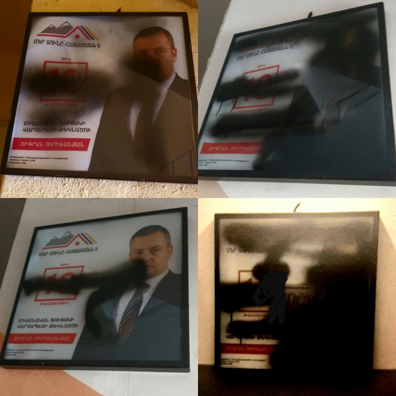 Վերջին օրերին մեր շտաբի ներկայացուցիչները ֆիքսել են հետևյալը՝ բազմաթիվ շենքերում միատիպ ձեռագրով վնասվում և փչացվում են տեղադրված լուսատախտակները: Նույն մեթոդաբանությամբ խոչընդոտվում են օրինական քարոզչություն իրականացնելու մեր հնարավորությունները: Բացի այն, որ դա տարրական այլանդակություն է, որն իրականացնում են դժկամ և վարկաբեկված մրցակիցները, դա նաև առաջացնում է քրեական պատասխանատվություն: