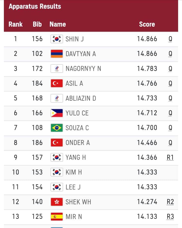 Դավթյանը երկրորդ տեղով է անցել եզրափակիչ, թեպետ որակավորման փուլից հետո առաջին տեղը զբաղեցրած կորեացի մարզիկը նույնքան միավոր է վաստակել: