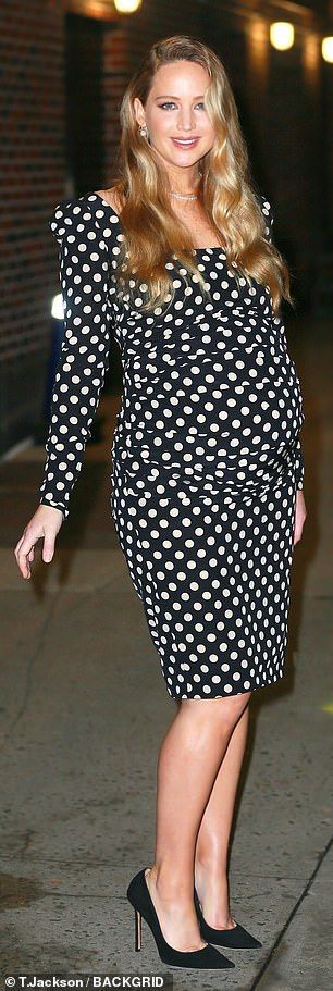 31-ամյա Լոուրենսն այս անգամ ներկայացել էր մարմնին կիպ նստող, սպիտակ պուտերով զգեստով, որն էլ ավելի էր ընդգծում հղիությունը: