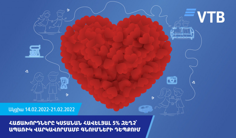 Մինչև փետրվարի 21-ը ՎՏԲ-Հայաստան Բանկի գործընկեր կազմակերպությունների վաճառակետերում ապառիկ վարկավորմամբ գնումներ կատարելու դեպքում հաճախորդները կստանան զեղչ: Զեղչը կկազմի վարկի գումարի 5%-ը: