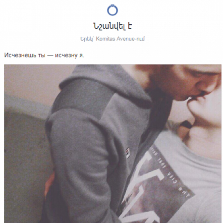 Facebook սոցցանցից տեղեկանում ենք, որ օգտատեր Վովա Եղիազարյանը նշանվել է ինչ-որ տղայի հետ: