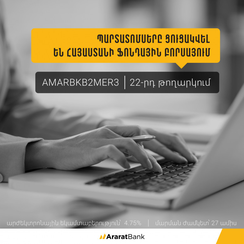 ԱրարատԲանկը տեղեկացնում է, որ պարտատոմսերի (AMARBKB2MER3) անվանական արժեքը 25 ԱՄՆ դոլար է, արժեկտրոնային եկամտաբերությունը` 4․75%, իսկ մարման ժամկետը՝ 27 ամիս։
