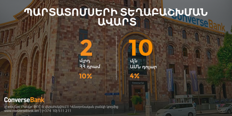 Կոնվերս Բանկը նախանշված ժամկետից շուտ ավարտել է 2 մլրդ ՀՀ դրամ եւ 10 մլն ԱՄՆ դոլար ընդհանուր ծավալով անվանական արժեկտրոնային պարտատոմսերի տեղաբաշխումը: