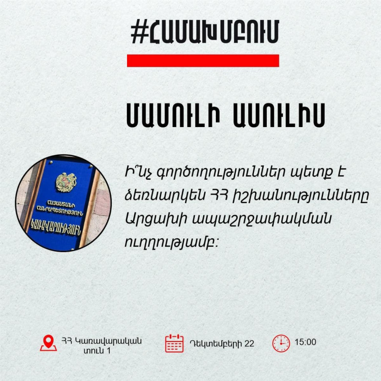 «Համախմբում» շարժման նախաձեռնող խումբն այսօր, դեկտեմբերի 22-ին՝ ժամը 15։00-ին, հրավիրում է մամուլի բաց ասուլիս ՀՀ կառավարության շենքի դիմաց, որի ընթացքում պահանջագիր կներկայացվի ՀՀ կառավարություն՝ գործողություններ ձեռնարկելու Արցախի ապօրինի շրջափակման վերացման ուղղությամբ: Հրավիրում ենք ձեզ ներկա գտնվել ասուլիսին, և մասնակցել բաց քննարկմանը:
