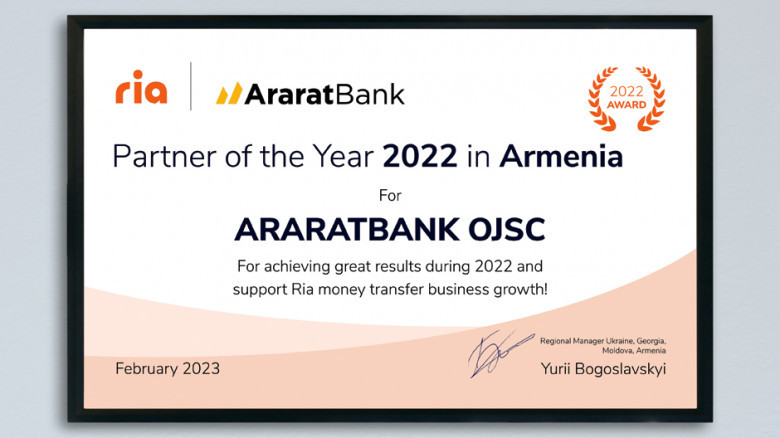 Ria Money Transfer համակարգն ԱրարատԲանկին հերթական անգամ արժանացրել է 2022թ․ «Տարվա գործընկեր» մրցանակին։
