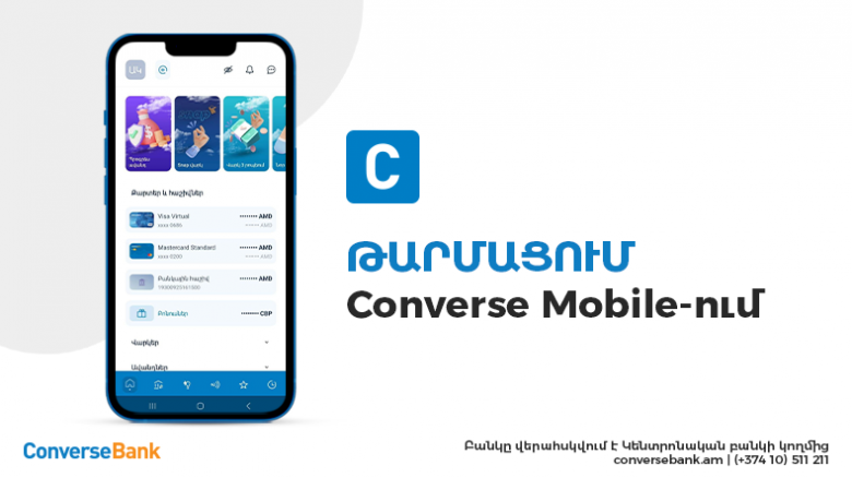 Converse Mobile-ի զարգացման ծրագրի շրջանակում Կոնվերս Բանկը ներկայացրել է նոր, թարմացված Հավելվածը՝ ավելի ֆունկցիոնալ ու գրավիչ ինտերֆեյսով: