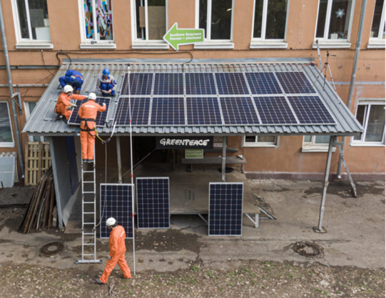 Asi.org.ru-ն գրում է, որ Greenpeace-ն իր պահեստի տանիքին արևային էլեկտրակայան է տեղադրել: Ընդհանուր առմամբ, Greenpeace-ի Մոսկվայի պահեստի տանիքին տեղադրվել է 16 արևային մարտկոց։ Ենթադրվում է, որ ստացված էներգիան բավական է պահեստը սպասարկելու համար։