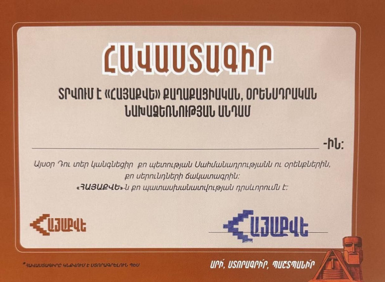 ՀայաՔվե-ի ստորագրահավաքին միացված յուրաքանչյուր քաղաքացի ստանում է այսպիսի Հավաստագիր։