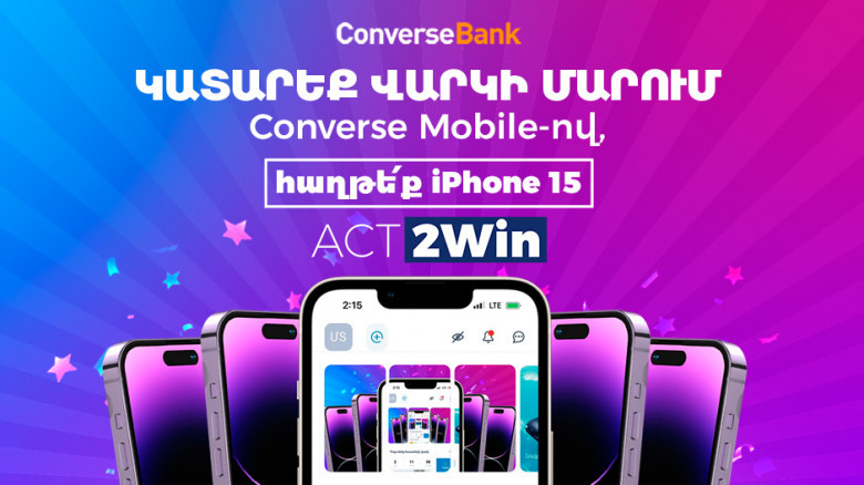 Կոնվերս Բանկը հայտարարում է խրախուսման ACT2WIN արշավը հաճախորդների համար: Մրցույթի պայմանները պարզ են, ինչի շնորհիվ դրան կարող է մասնակցել և հինգ iPhone 15-ի խաղարկությանը մասնակցել Բանկի հաճախորդների հնարավորինս լայն շրջանակ: Մասնավորապես, արշավին մասնակցելու համար ընդամենը հարկավոր է.