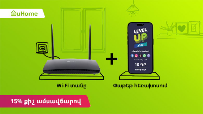 Մանրամասնենք, որ uHome 8000 սակագնային փաթեթին միանալիս բաժանորդներն ընդամենը 8000 դրամ ամսավճարի դիմաց կստանան անսահմանափակ գերարագ ինտերնետ նոր Wi-Fi սարքով, Level Up 3000 հետվճարային սակագնային պլանի բոլոր ներառումներից օգտվելու հնարավորություն, ինչպես նաև մինչև 3 Սուպեր SIM-քարտ՝ հատուկ գնով։ Դրա շնորհիվ ընդամենը 1500 դրամով ընտանիքի կամ փոքր ձեռնարկատիրության յուրաքանչյուր անդամ կունենա 500 րոպե դեպի տեղական բոլոր ցանցեր, Արցախ, ԱՄՆ և Կանադա զանգելու համար, 10 ԳԲ գերարագ շարժական ինտերնետ, 28 հայտնի հավելվածներից օգտվելու հնարավորություն՝ առանց մեգաբայթերն սպառելու և 300 SMS՝ տեղական բոլոր ցանցեր ուղարկելու համար։