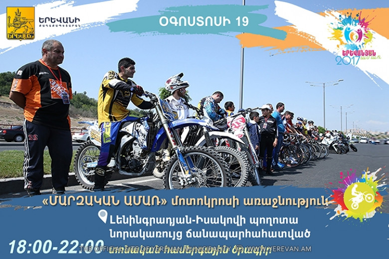 Երևանի քաղաքապետարանի «Երևանյան ամառ 2017» եռամսյա միջոցառումների ծրագրի շրջանակում օգոստոսի 19-ին` ժամը 18:00-ից մինչև 22:00-ն, մայրաքաղաքի Լենինգրադյան-Իսակովի պողոտայի նորակառույց ճանապարհահատվածում տեղի կունենա «Մարզական ամառ» սպորտային միջոցառումը, որի ժամանակ ներկաներն ականատես կլինեն մոտոկրոսի, հեծանվավազքի և սպորտային մեքենաների ցուցադրական ելույթների: