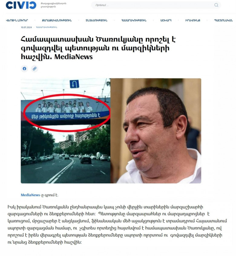 2024թ Փարիզի օլիմպիական խաղերը դեռ չմեկնարկած իշխանական լրատվականներից մեկում ` Civic.am-ում հոդված էր գրվել, որտեղ բառացի ասվում էր․ «ՀԱՕԿ նախագահ Գագիկ Ծառուկյանը ընդհանրապես կապ չունի վերջին տարիներին մարզաշխարհի զարգացումների ու ձեռքբերումների հետ:Պետությունը մարզասրահներ ու մարզադպրոցներ է կառուցում,մրցաշարեր է անցկացնում, ֆինանսական մեծ աջակցություն է տրամադրում Հայաստանում սպորտի զարգացման համար ու չգիտես որտեղից հայտնվում է Ծառուկյանը ու որոշում է իրեն վերագրել պետության ձեռքբերումները…»: