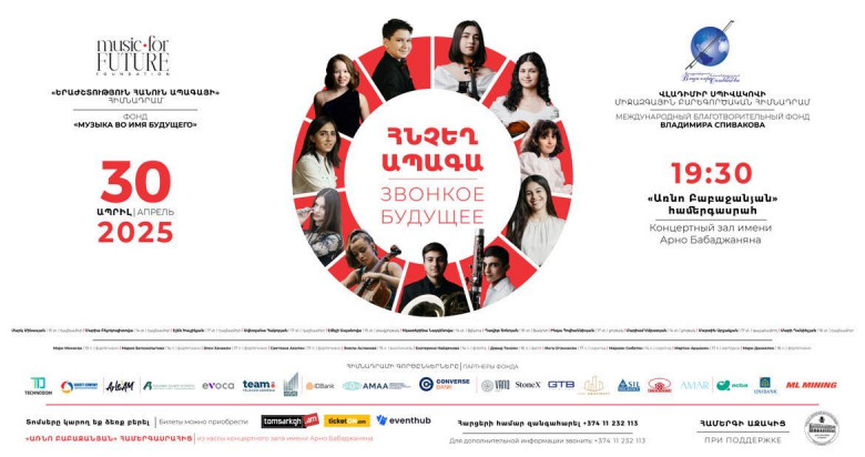 Ապրիլի 30-ին՝ ժամը 19։30-ին, «Առնո Բաբաջանյան» համերգասրահում տեղի կունենա «Հնչեղ ապագա» խորագրով համերգը՝ «Երաժշտություն հանուն ապագայի» հիմնադրամի և Վլադիմիր Սպիվակովի միջազգային բարեգործական հիմնադրամի կրթաթոշակառուների մասնակցությամբ: Համերգը կազմակերպվում է «Մոսկվայի տուն» մշակութային գործարար կենտրոնի աջակցությամբ։ Իսկ տոմսերի վաճառքից ստացված ողջ հասույթը կուղղվի «Երաժշտություն հանուն ապագայի» հիմնադրամի տաղանդավոր երաժիշտների համար իրականացվող կրթական ծրագրերին: Այս համերգը ևս մեկ կարևոր քայլ է մասնագիտական բարձունքների ձգտող երիտասարդ երաժիշտների ստեղծագործական զարգացման և մշակութային փոխանակման ուղղությամբ։