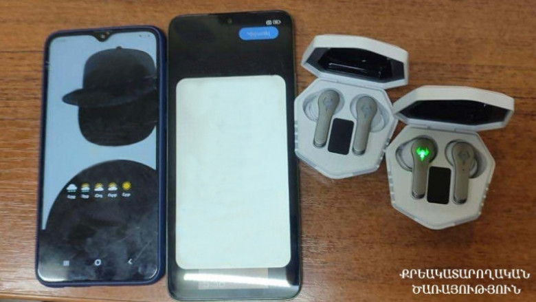 Խուզարկության արդյունքում կալանավորված անձի գոտկատեղի հատվածից ծառայողները հայտնաբերել են թաքցված 2 բջջային հեռախոս և 2 զույգ անլար ականջակալ։