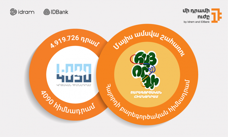 «Մի դրամի ուժի» բարի գործերին մասնակից դառնալու համար ընդամենը Ձեր բոլոր վճարումները կատարեք Idram&IDBank հավելվածով, IDBanking.am և banking.idram.am առցանց հարթակներով, Իդրամի և IDBank-ի տերմինալներով, և Ձեր յուրաքանչյուր վճարման դիմաց ընկերությունները մեկ դրամ կուղղեն կարևոր ծրագրերին։
