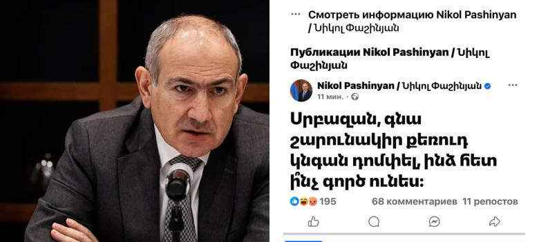 Այսօր առավոտյան արդեն հայ հասարակությունն արթնացավ Նիկոլ Փաշինյանի խայտառակ գրառումներով սոց ցանցերում։ «Սրբազան, գնա շարունակիր քեռուդ կնգան դոմփել, ինձ հետ ի՞նչ գործ ունես»,- գրել էր Փաշինյանը, քիչ անց էլ հավելել. «Իսկ անհրաժե՞շտ է առերեսվել հարցին, թե մեր եպիսկոպոսաց դասից քանի հոգի է հավատարիմ կուսակրոնության ուխտին»։ Իրականում սա հստակ համակարգված, հակաեկեղեցական քայլ է, որին մասնակից են ոչ միայն Հայաստանի վարչապետի պաշտոնը զբաղեցնողը, նրա տիկինը, այլ մի ամբողջ թիմ, այդ թվում նաև Արևմուտքում, Թուրքիայում և Ադրբեջանում։ Ըստ վերլուծաբանների՝ եկեղեցուն կոնկրետ թիրախավորել են, քանի որ համազգային մոբիլիզացիա ընդդեմ գործող իշխանությունների այսօր ունակ են կազմակերպել միայն եկեղեցականներն ու հոգևոր գործիչները։ Վկան՝ Բագրատ Սրբազանի շարժումը։