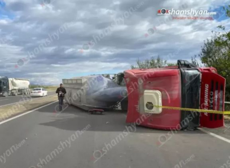 Արարատում կցորդիչով բեռնատարն անվադողի պայթելու հետևանքով դուրս է եկել հանդիպակաց գոտի և կողաշրջվել