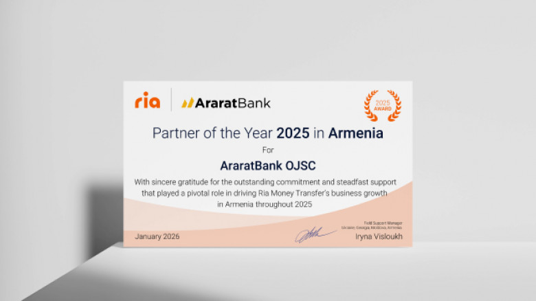 AraratBank has been named RIA Money Transfer's Partner of the Year in Armenia for 2025 — the seventh consecutive year the Bank has earned this recognition. The achievement speaks to a long-standing and highly effective partnership, as well as AraratBank's consistently strong and leading position in the country's financial sector.