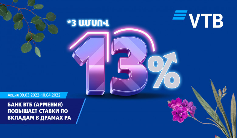 В рамках акции ВТБ (Армения) повышает ставки по вкладам для физических лиц «Выгодный» и «Прогрессивный» в драмах РА. Максимальная процентная доходность по депозитам достигает 13.49% годовых.
