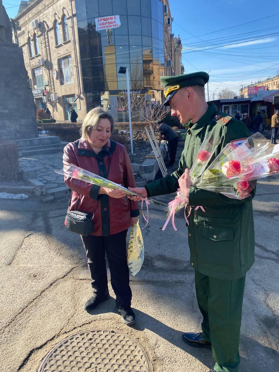 Сегодня офицеры базы на улицах города дарили представительницам прекрасной половины Армении цветы.