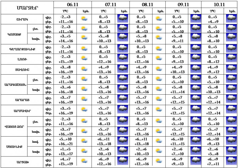 Նոյեմբերի 6-ին, 8-ին սպասվում է առանց տեղումների եղանակ։ 7-ին, 9-10-ին սպասվում է անձրև: