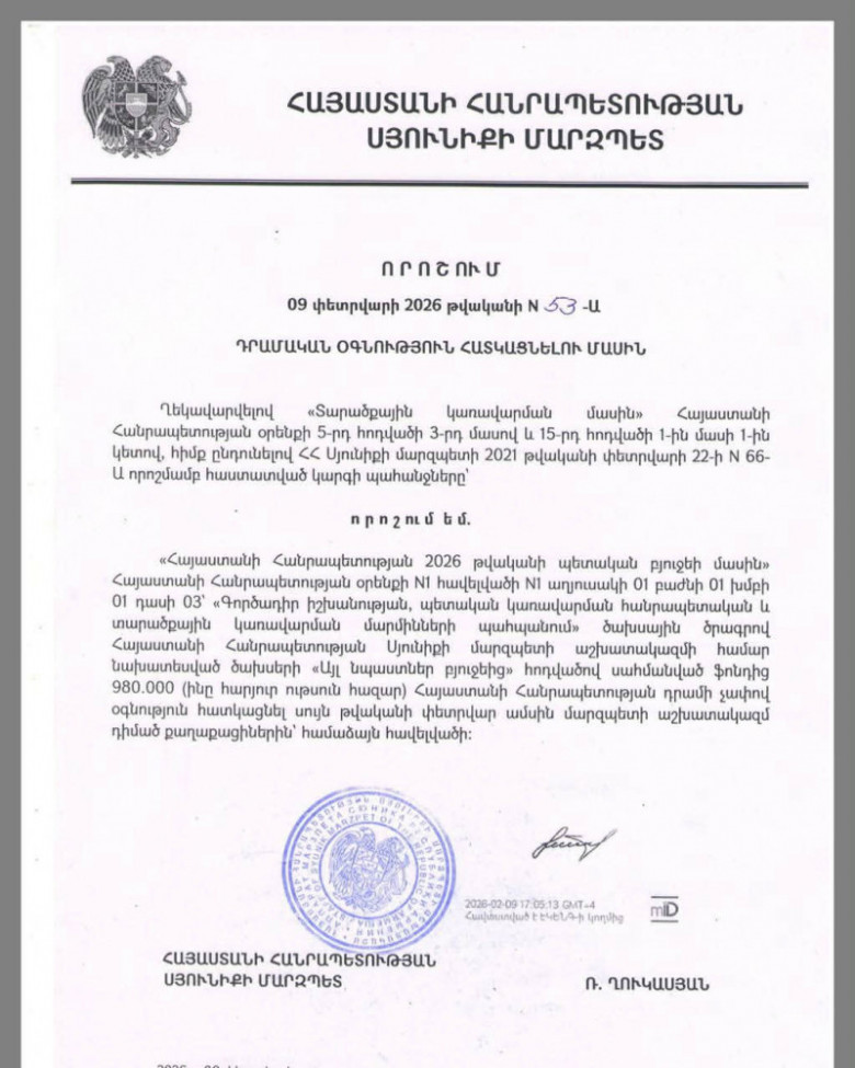 Սյունիքի մարզպետը ֆինանսական աջակցություն է բաժանել բնակիչներին Փետրվարի 9-ին՝ հրամանագրի ուժի մեջ մտնելուց ընդամենը երկու օր անց, Սյունիքի մարզպետը որոշում է ստորագրել՝ մարզի բնակիչներին ֆինանսական աջակցություն տրամադրելու վերաբերյալ։ Քրեական օրենսգրքի համաձայն՝ ընտրակաշառքի հանցագործության համար համար կարող է սպառնալ մինչև 10 տարվա ազատազրկում։ Այս պահի դրությամբ իրավապահ մարմինները դեռևս պաշտոնական որոշում չեն կայացրել՝ գործով քրեական վարույթ նախաձեռնելու վերաբերյալ։