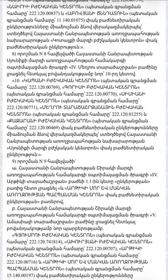 10. «ԿԱՊԱՆԻ ԲԺՇԿԱԿԱՆ ԿԵՆՏՐՈՆ» (պետական գրանցման համարը՝ 222.120.00769), «ԳՈՐԻՍԻ ԲԺՇԿԱԿԱՆ ԿԵՆՏՐՈՆ» (պետական գրանցման համարը՝ 222.120.00770), «ՍԻՍԻԱՆԻ ԲԺՇԿԱԿԱՆ ԿԵՆՏՐՈՆ» (պետական գրանցման համարը՝ 222.120.00771), «ՄԵՂՐՈՒ ՏԱՐԱԾԱՇՐՋԱՆԱՅԻՆ ԲԺՇԿԱԿԱՆ ԿԵՆՏՐՈՆ» (պետական գրանցման համարը՝ 222.120.01255) և «ՔԱՋԱՐԱՆԻ ԲԺՇԿԱԿԱՆ ԿԵՆՏՐՈՆ» (պետական գրանցման համարը՝ 222.120.00469) փակ բաժնետիրական ընկերությունները միաձուլման ձևով վերակազմակերպել՝ ստեղծելով Հայաստանի Հանրապետության առողջապահության նախարարության «Սյունիքի մարզի բժշկական կենտրոն» փակ բաժնետիրական ընկերություն: