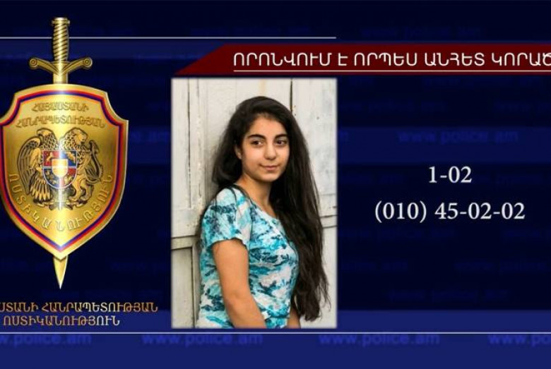 15-ամյա աղջկա գտնվելու վայրի մասին տեղեկություն իմացողներին ոստիկանությունը խնդրում է դիմել Էրեբունու կամ մոտակա բաժին կամ զանգահարել 1-02, (010) 45 02 02 հեռախոսահամարներով: