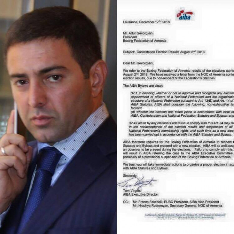 Այսօր արդեն ՀԱՕԿ գլխավոր քարտուղարը հրապարակել է ԱԻԲԱ-ից (բռնցքամարտի միջազգային միություն) ստացված նամակը, ովքեր ուսումնասիրել են օգոստոսի 2-ի ֆեդերացիայի նախագահի ընտրությունները, և փաստել, որ դրանց լեգիտիմ չեն եղել և հակասել են ԱԻԲԱ-ի կանոնադրությանը:
