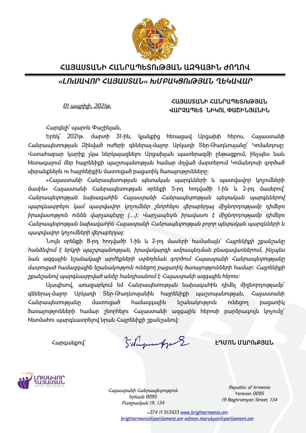 Ըստ այդմ, վարչապետին առաջարկել եմ Հանրապետության նախագահին դիմել միջնորդությամբ՝ գեներալ-մայոր Արկադի Տեր-Թադևոսյանին հայրենիքի պաշտպանության, Հայաստանի Հանրապետությանը մատուցած համազգային նշանակություն ունեցող բացառիկ ծառայությունների համար շնորհելու Հայաստանի ազգային հերոսի բարձրագույն կոչումը՝ հետմահու պարգևատրելով նրան Հայրենիքի շքանշանով։