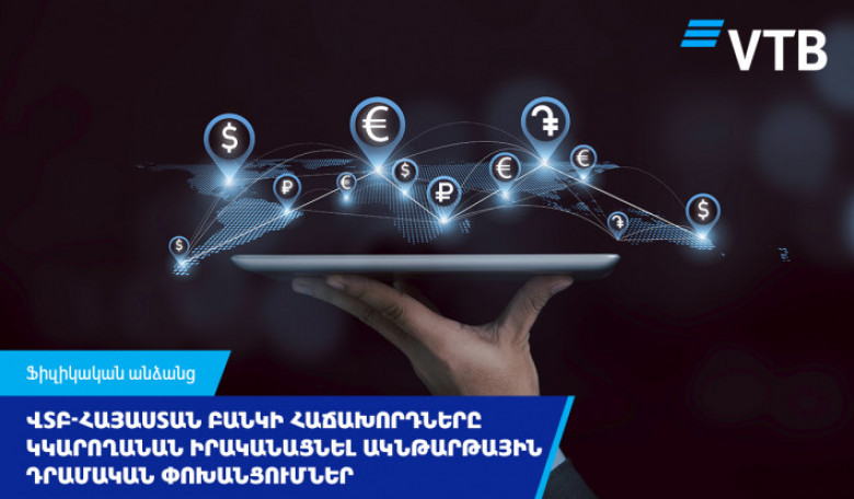ՎՏԲ-Հայաստան Բանկի հաճախորդները ստացել են հնարավորություն՝ իրականացնելու դրամական փոխանցումներ անմիջապես արտասահմանյան բանկերի Visa, Mastercard, МИР, Union Pay քարտերին, ինչպես նաև Եվրամիության երկրների բանկային հաշիվներին: Գումարը փոխանցվում է հաշվին ակնթարթորեն, իսկ միջնորդավճարը կազմում է փոխանցվող գումարի մինչև 1,5%-ը: