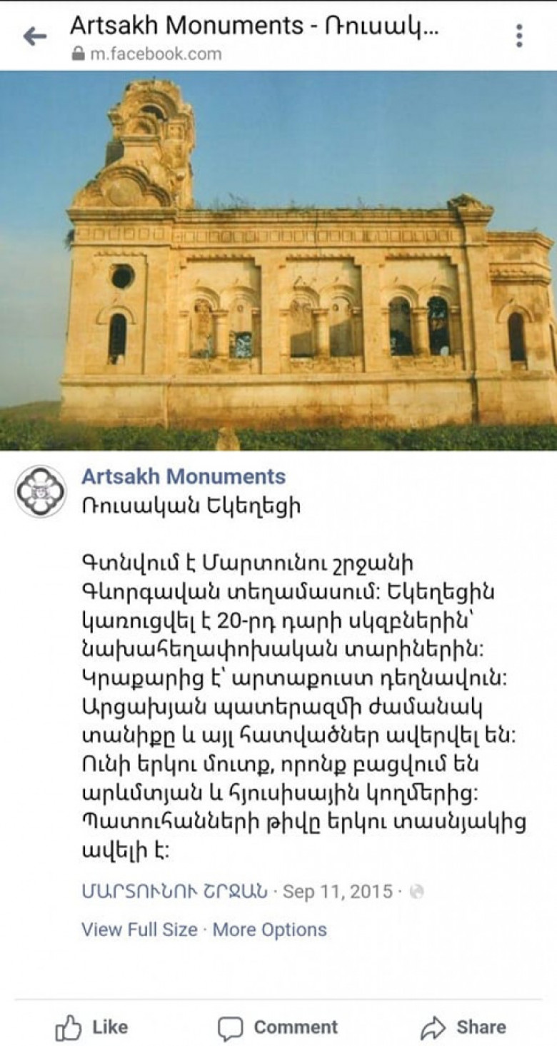 Այսպիսով, ոմն Անաստասիա Լավրինայի ու Հունաստանում Ադրբեջանի դեսպանության կողմից հունարեն թարգմանությամբ` Արցախի Հանրապետության տարածքում գտնվող ռուսական ուղղափառ կրոնական ժառանգության նկատմամբ հայկական կողմի իբր «ոտնձգությունների» մասին տարածվող քարոզչական նյութը հանդիսանում է հերթական սադրիչ, անհիմն և կեղծ ապատեղեկատվությունը․ այն նպատակ ունի հայերի նկատմամբ ատելություն տարածելով փորձել խարխլել և սեպ խրել Հայաստանի ու իր բարեկամների միջև հարաբերություններում: Մշակութային հուշարձանները դիտավորյալ ոչնչացնող երկիրը փորձում է անհիմն մեղադրանքներով քողարկել իր իսկ կողմից իրականացված բազմաթիվ վանդալիզմի դեպքերը։