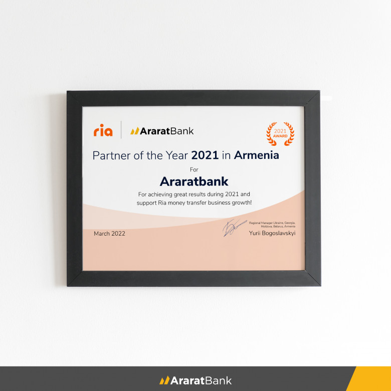 ԱրարատԲանկը Ria Money Transfer համակարգի կողմից հերթական անգամ արժանացել է 2021թ․«Տարվա գործընկեր» մրցանակին։