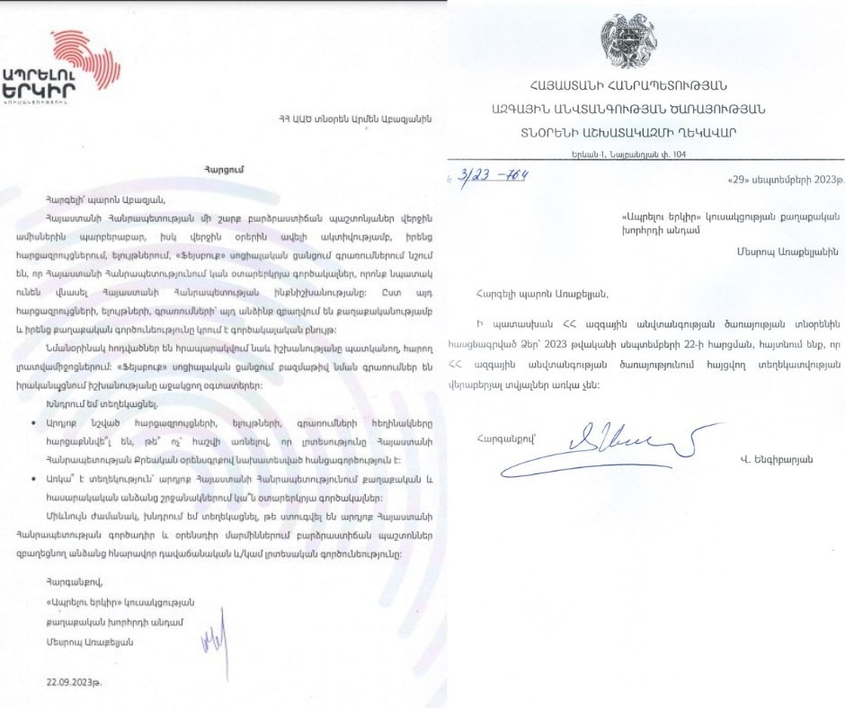 Շաբաթներ առաջ դիմել էի ԱԱԾ, թե արդյոք Հայաստանի Հանրապետությունում քաղաքական և հասարակական անձանց շրջանակներում կան օտարերկրյա գործակալներ՝ հաշվի առնելով, որ իշխանություններն անդադար նշում են, որ Հայաստանում կան օտարերկրյա գործակալներ։