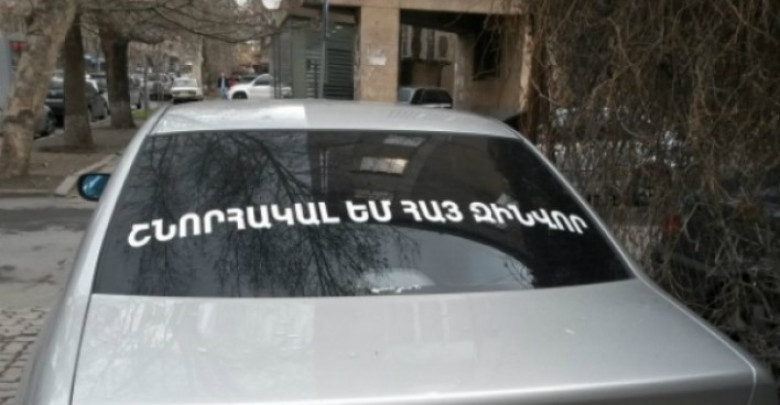 Անցնում եմ փողոցով, տեսնում եմ մի 35-40 000 $-ոց ու «գոլդ» համարով (վերջավորությունը՝ 666) մեքենա է կանգնած, ետևի կողապակուն սպիտակ տառերով գրված՝ «Շնորհակալ եմ հայ զինվոր»։