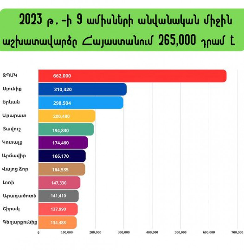Ինչպես միշտ, ՍՅՈՒՆԻՔՆ ԱՌԱՋԱՏԱՐ Է, իսկ ԶՊՄԿ-ում միջին անվանական աշխատավարձը գրեթե ԵՐԿՈՒՍՈՒԿԵՍ անգամ գերազանցում է Հայաստանի և շուրջ ՉՈՐՍՈՒԿԵՍ անգամ Շիրակի ու Գեղարքունիքի մարզերի ցուցանիշներին։ Կից գրաֆիկում ներկայացված է պատկերն ըստ Երևանի և մարզերի։