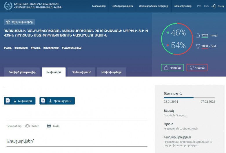 ԿԳՄՍՆ-ի մոգոնած և մեծ աղմուկ բարձրացրած նախագիծը՝ «Հայոց պատմություն» առարկան «Հայաստանի պատմություն» վերանվանելու հետ կապված, ընդամենը մի քանի օր էր տեղադրվել իրավական ակտերի նախագծերի հրապարակման միասնական կայքում՝ e-draft.am-ում, երբ «Փաստն» արձանագրեց, որ քվեարկությունը զարմանալի զարգացումներ է ստանում: Նշել էինք, թե այնպիսի տպավորություն է, որ կազմակերպվել է «ֆեյքային» գրոհ, որպեսզի «դեմ» քվեարկողների թիվն այդքան շատ չերևա: