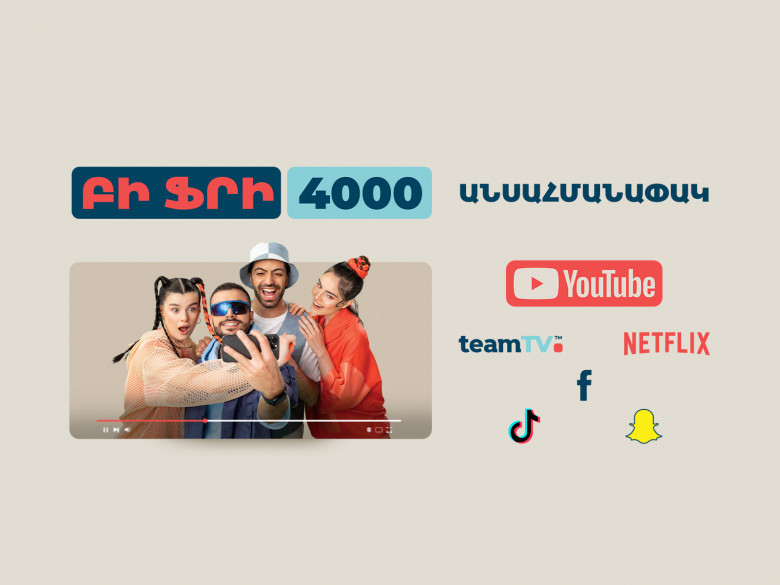 Team Telecom Armenia-ն մշակել է նոր Բի Ֆրի փաթեթ, որը հնարավորություն է տալիս օգտվել հիմնական վիդեո հարթակներից անսահմանափակ՝ առանց ինտերնետի սպառման։ Այս առաջարկն ընգրկում է YouTube, Netflix, Snapchat, TikTok ու այլ թոփ հավելվածներ։ «Բի Ֆրի 4000» փաթեթը ստեղծելիս ընկերությունը հիմնվել է բաժանորդների վարքագծի ուսումնասիրության վրա։