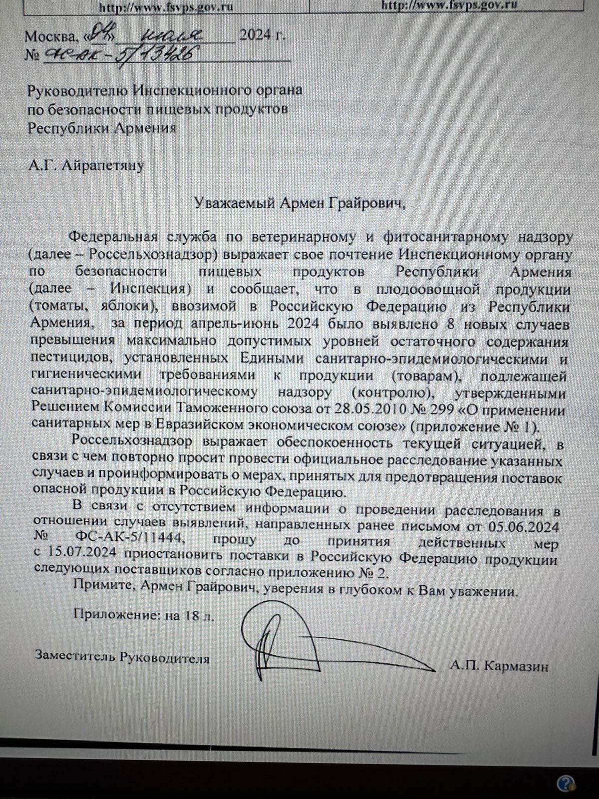 Մեր ձեռքի տակ է հայտնվել Ռոսսելխոզնադզորի ղեկավարի տեղակալի գրությունը՝ ուղղված Հայաստանի Սննդամթերքի անվտանգության տեսչական մարմնի ղեկավար Արմեն Հայրապետյանին՝ «անհանգստություն հայտնելով» այն մասին, որ միայն ապրիլ-հունիսին հայտնաբերվել են նոր դեպքեր՝ կապված Հայաստանից Ռուսաստան արտահանվող պտուղ-բանջարեղենում պեստիցիդների քանակի՝ նորմայից գերազանցման հետ:
