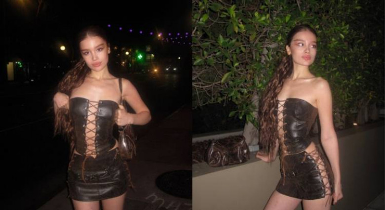 Մալենան կրել է շագանակագույն, լայն բացվածքով տոպ ու կարճ կիսաշրջազգեստ։ Տեսքը լրացրել է մեծ պայուսակով։ Կողքից բացվածք ունեցող կիսաշրջազգեստի տակից երևում է նաև շագանակագույն վարտիքը։