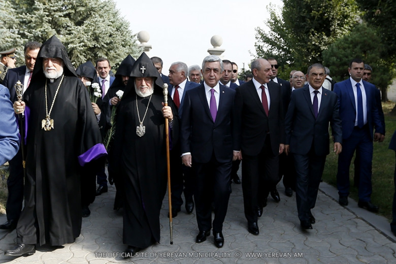 Հայաստանի Հանրապետության անկախության 26-րդ տարեդարձի առթիվ Նախագահ Սերժ Սարգսյանը Արցախի Հանրապետության Նախագահ Բակո Սահակյանի, Ն.Ս.Օ.Տ.Տ. Գարեգին Բ Ծայրագույն Պատրիարք և Ամենայն Հայոց Կաթողիկոսի, Մեծի Տանն Կիլիկիո Կաթողիկոս Ն.Ս.Օ.Տ.Տ. Արամ Առաջինի հետ, Երևանի քաղաքապետ Տարոն Մարգարյանի և Հանրապետության բարձրագույն ղեկավարության ուղեկցությամբ այսօր այցելել է «Եռաբլուր» զինվորական պանթեոն՝ հարգանքի տուրք մատուցել իրենց կյանքը Հայրենիքի անկախության համար զոհաբերած հայորդիների հիշատակին: