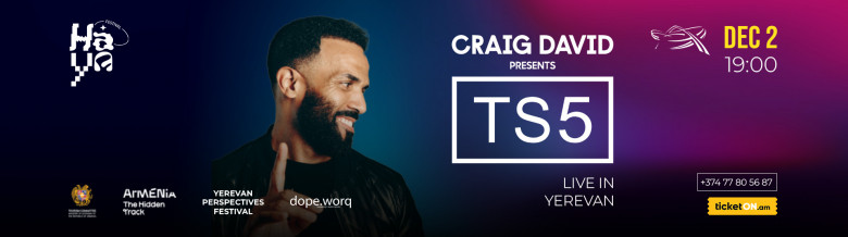 Մեգա աստղ բրիտանացի արտիստ Քրեյգ Դեյվիդը կներկայացնի իր հանրահայտ, ցնցող TS5 շոուն, որով նա հանդես է եկել աշխարհի խոշոր դահլիճներում՝ Լոնդոնից մինչև Լոս Անջելես, «Գլաստոնբերի»-ից մինչև O2 Academy Brixton։ Համերգի ընթացքում Քրեյգ Դեյվիդը կկատարի "7 Days", "Fill Me In", "Walking Away" հիթերը՝ զուգակցված բացառիկ DJ ռեմիքսներով։