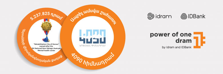 «Մի դրամի ուժի» բարի գործերին մասնակից դառնալու համար ընդամենը Ձեր բոլոր վճարումները կատարեք Idram&IDBank հավելվածով, IDBanking.am և banking.idram.am առցանց հարթակներով, Իդրամի և IDBank-ի տերմինալներով, և Ձեր յուրաքանչյուր վճարման դիմաց ընկերությունները մեկ դրամ կուղղեն կարևոր ծրագրերին։