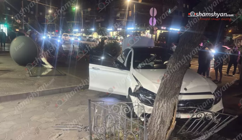Երևանում «Mercedes»-ը կոտրել է գովազդային ցուցանակը, բախվել ծառին
