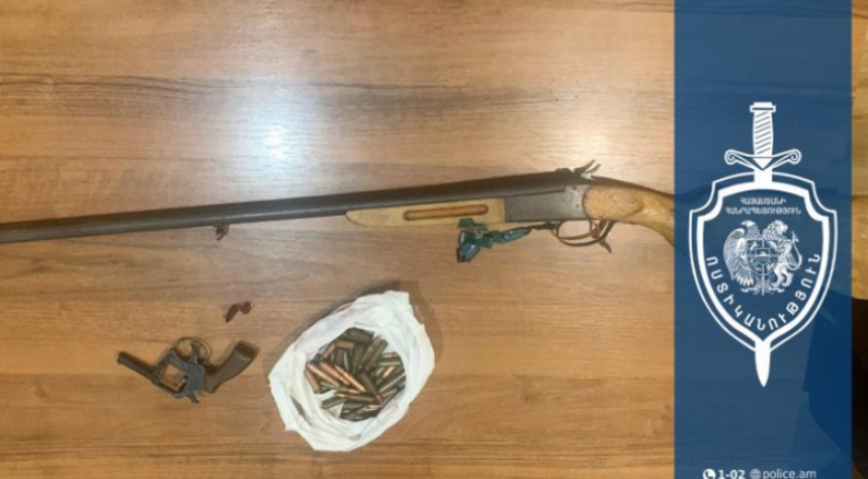 Նշված վայր մեկնած համայնքային ոստիկանները հայտնաբերել են պոլիէթիլենային տոպրակ և ծղոտե պարկ, որոնց մեջ եղել է որսորդական հրացան, թմբուկավոր ատրճանակ և զինամթերք։