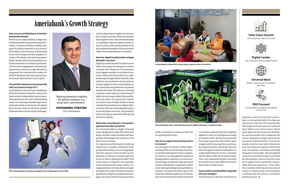 Բացի այդ, զեկույցում տեղ է գտել Ամերիաբանկի ֆինանսական գծով տնօրեն Հովհաննես Թորոյանի հարցազրույցը, որտեղ խոսվում է Հայաստանի տնտեսության մեջ Ամերիաբանկի նշանակալի դերակատարության մասին` որպես վարկային պորտֆելով խոշորագույն ֆինանսական հաստատության: